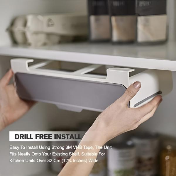 Плъзнете го под рафтовете, за да оптимизирате чекмеджетата, шкафовете и цялостното кухненско пространство.