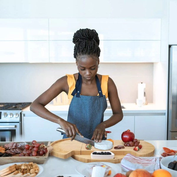 Този поднос не само елегантно показва вашите закуски, но и служи като дъска за рязане. Гладката му дървена повърхност улеснява нарязването и сервирането на всички ваши любими закуски на едно място.